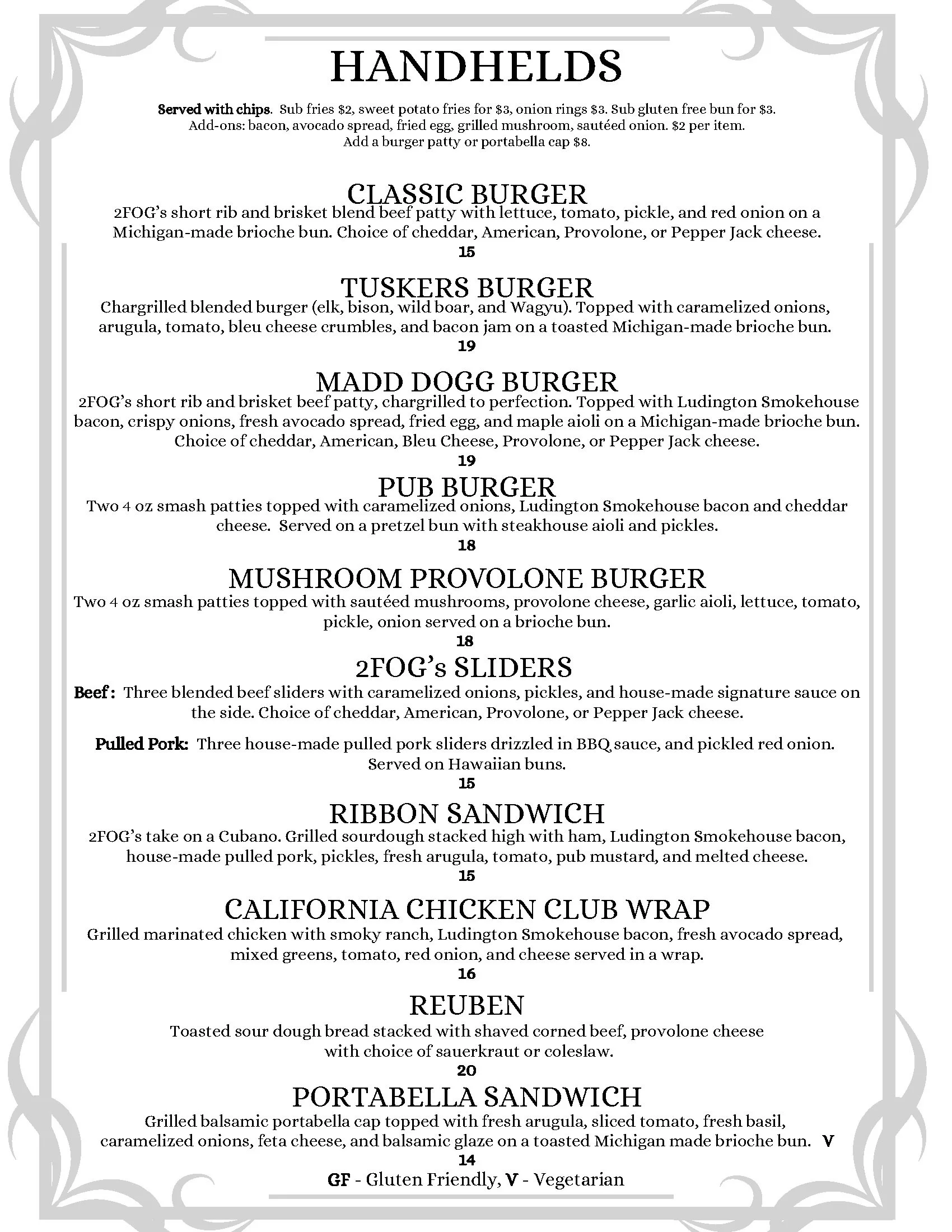 2FOG's Pub originally opened in March 2015, and reopened in October 2020 in the basement of the Heart of Howell building, in historical downtown Howell, MI. 2Fog’s has a full Lunch, Dinner and Sunday Brunch menu featuring the freshest ingredients as well as classic cocktails, martinis and Michigan craft beers.